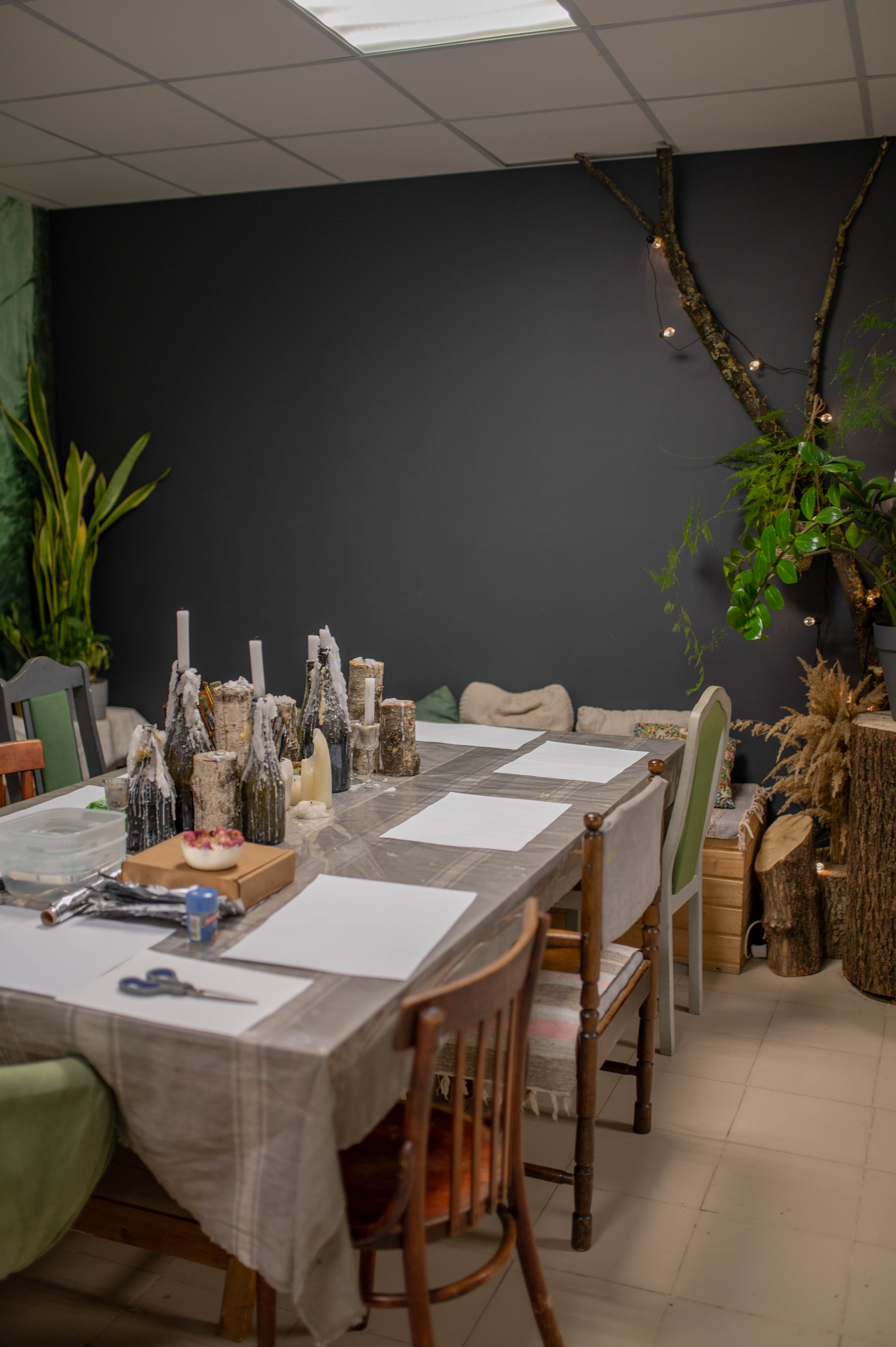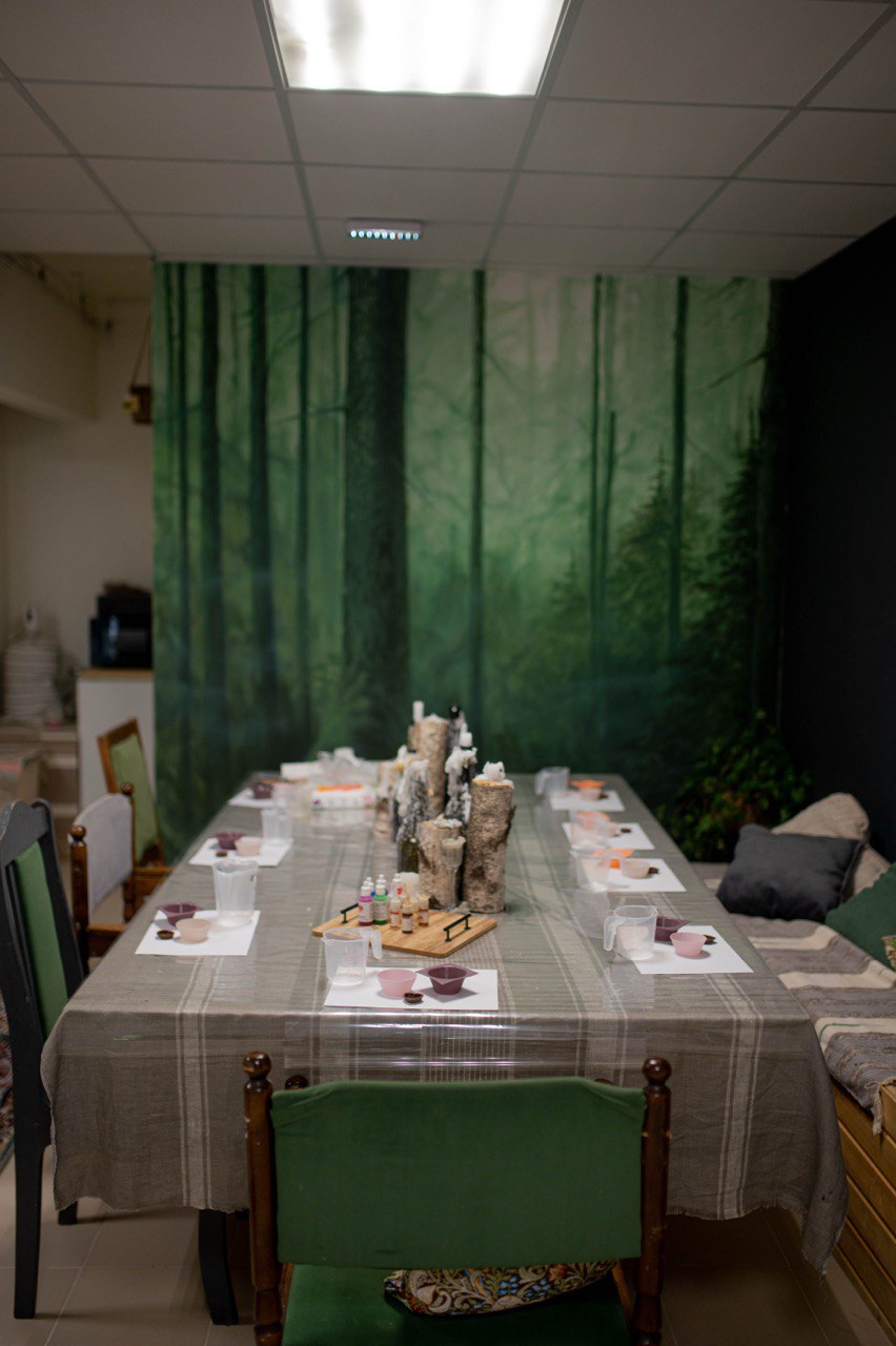 В зоне для мастер-классов находится большой стол на 10-12 человек, с декором и возможность зажечь свечи. При необходимости можно увеличить количество участников.